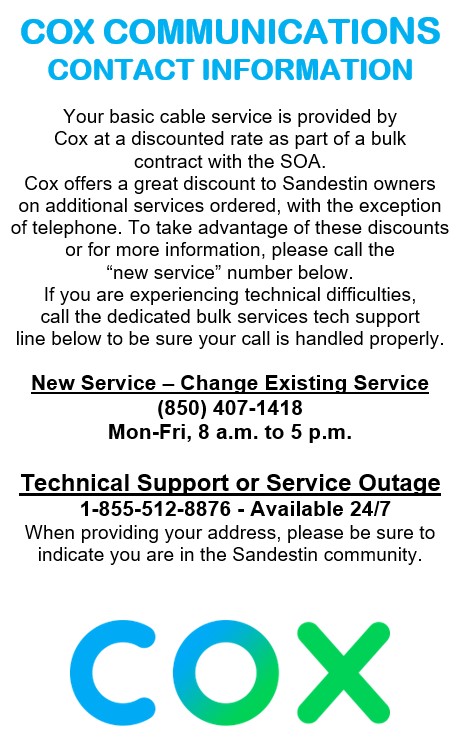 Welcome to Sandestin! Whether you purchased your property here for retirement, for vacation, or as an investment, there is a lot to learn about the Community and the different relationships. We hope this website, as well as the links below will assist you with becoming acquainted with the SOA and answers many questions you may have. Start here with the “Welcome Letter”.